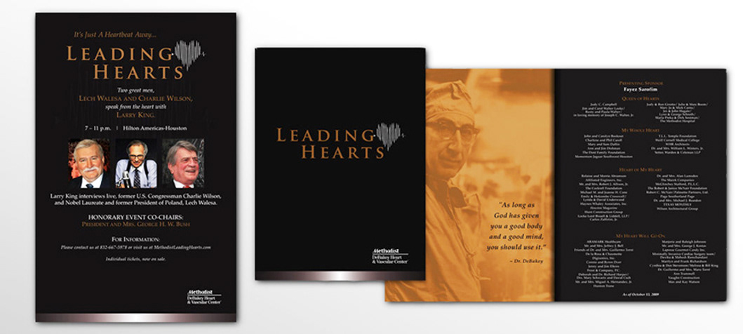 Leading Hearts is a banquet series held by Houston Methodist, where they honor a different doctor each time. This event needed a program, poster and easel sign designed for the Houston Methodist event series